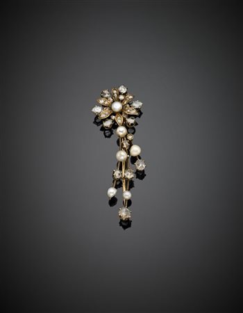 Spilla in oro giallo e diamanti a mezza rosetta rifinita con perle a bottone, g 7,20 circa, lungh. cm 5,50 circa. (lievi difetti)