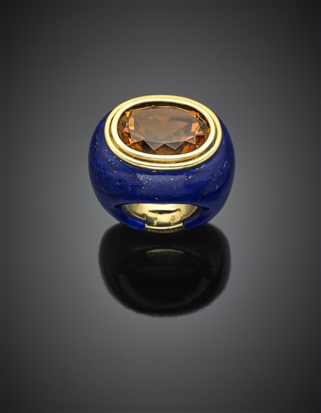 Anello ricavato da un unico blocco in lapislazzuli, rifinito con castone e interno dell'anello in oro giallo, al centro quarzo madeira ovale, g 41,80 circa misura 13/53. Firmato e marcato Sanalitro Milano, 1075 MI.