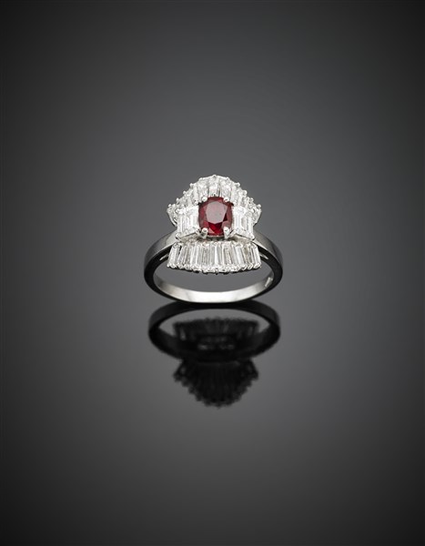 Anello in platino con diamanti per complessivi ct. 2,30 circa e rubino centrale, g 6,70 circa misura 12/52. Marcati MI 730.