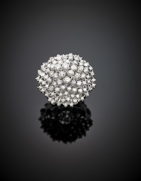 Anello in oro bianco con diamanti di varie forme e tagli per complessivi ct. 4,30 circa, g 12,40 circa misura 16/56.