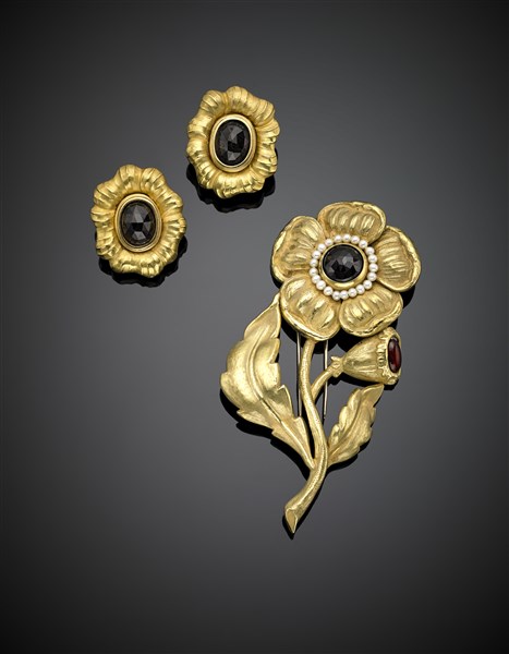Yellow gold garnet and pearl floral jewelry set comprising cm 12 circa brooch and cm 4 circa earclips, in all g 70.50 circa. The brooch signed Giansanti. (defects)
