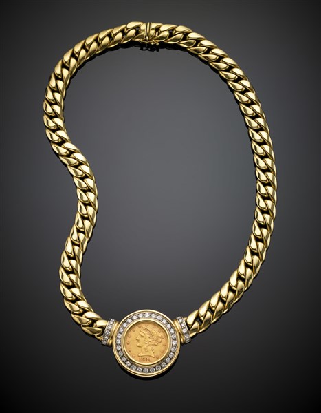 Collier in oro giallo a maglia groumette con al centro moneta da cinque dollari americana rifinita in diamanti per complessivi ct. 1,50 circa, g 69,70 circa, lungh. cm 44 circa. Marcato 289 VI.