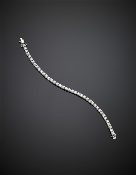 Bracciale tennis in oro bianco e diamanti rotondi per complessivi ct. 4 circa, g 15,60 circa, lungh. cm 18 circa.