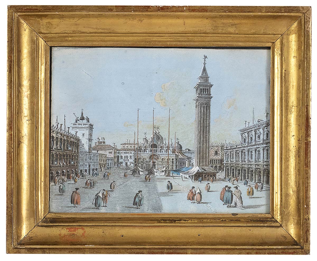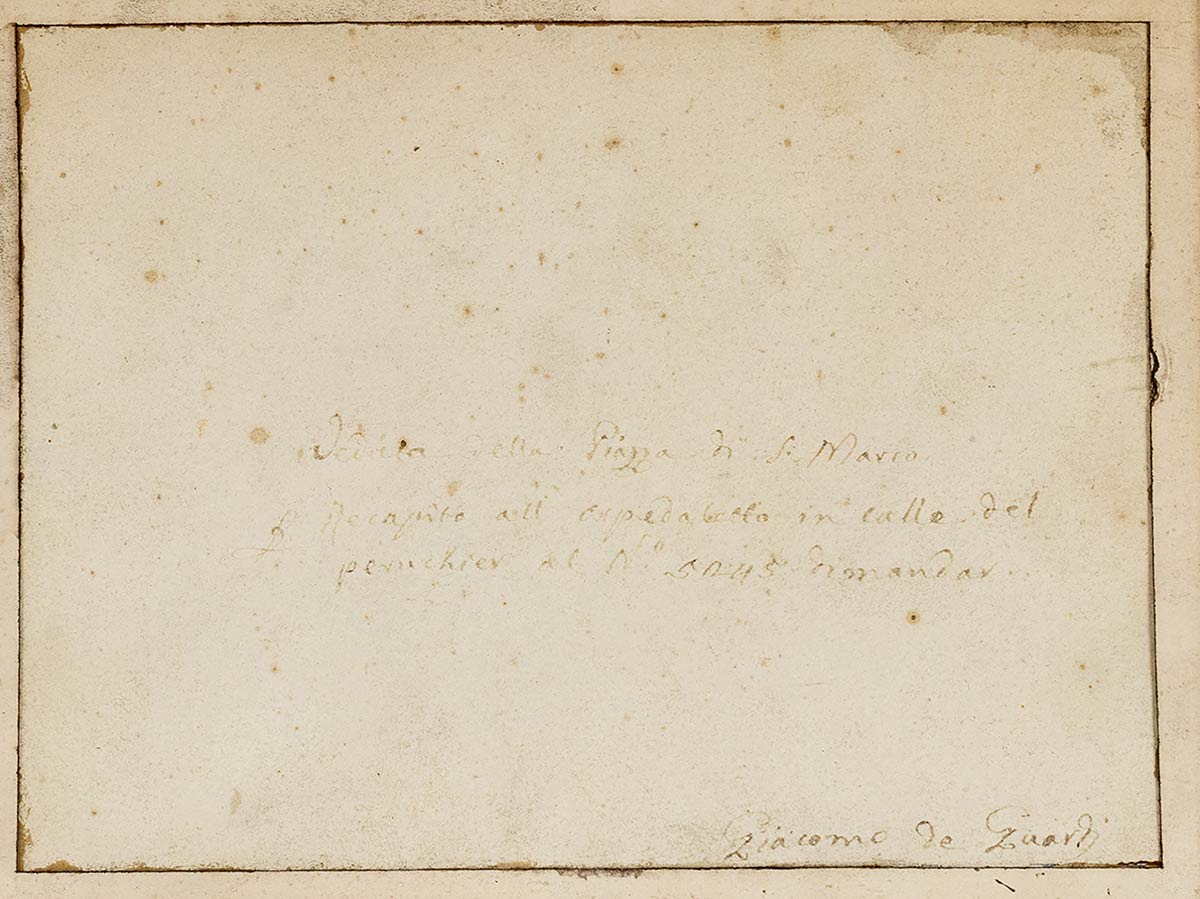 Al retro reca iscrizione autografa e firma a penna: "VEDUTA DELLA PIAZZA DI SAN MARCO / PER RECAPITO ALL’OSPEDALETTO IN CALLE DEL PERUCHIER AL N. 5045 DIMANDAR / GIACOMO DE GUARDI”.