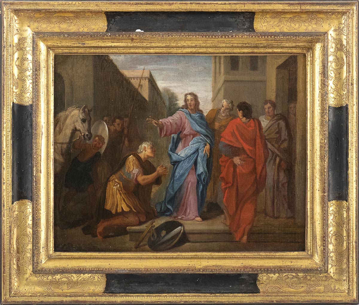 La tela raffigura la scena, raccontata nei Vangeli di Matteo e Luca, della guarigione del servo del centurione, miracolo operato da Cristo mentre si trovava a Cafarnao. È qui fissato il momento in cui il centurione, dopo aver fatto intercedere per sé alcuni emissari giudei, s’inginocchia al cospetto di Cristo chiedendogli aiuto. L’uso di colori come il giallo dell’armatura del centurione o il blu del mantello di Cristo, la misura dei gesti, l’equilibrio che traspare dalla composizione, ma anche una certa solennità scultorea e teatrale dei personaggi, sono elementi che rimandano alla ben meditata influenza di Nicolas Poussin e di Pietro da Cortona.