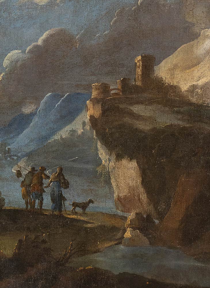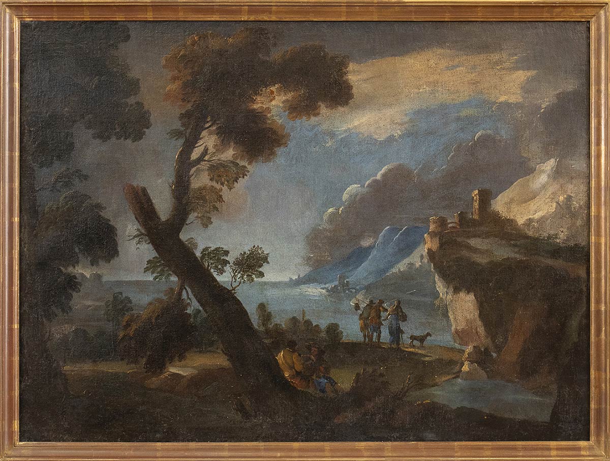 I due bei dipinti qui presentati (questo e quello al lotto successivo), entrambi raffiguranti paesaggi costieri di fantasia con figure, sono ascrivibili alla produzione del veneziano Bartolomeo Pedon, che tra la fine dei Seicento e i primi decenni del Settecento fu tra i più apprezzati specialisti nell'ambito dei paesaggi e dei capricci architettonici. Le nostre due tele presentano puntuali riferimenti con il nucleo di sei dipinti di Ca’ Borini, ad Este, considerato dalla storiografia il punto di avvio per ricostruire il corpus del pittore. All'interno di questo gruppo di sei opere si riconoscono utili termini di confronto con le notre tele in particolare col Paesaggio con pescatori, ove torna il motivo arboreo posto in primo piano, caratterizzato da un tronco parzialmente mozzato, come pure per le figure che animano la scena. Ricorrente anche lo sviluppo particolarmente accentuato dello sperone roccioso sormontato da edifici, presente in ambo le tele al centro della composizione, di cui soprattutto il torrione risulta elemento architettonico costante della produzione del maestro veneziano.