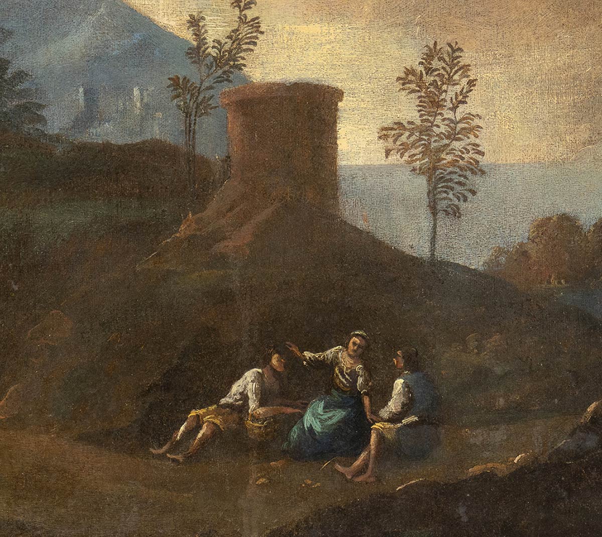 Paesaggio portuale con figure, imbarcazioni e torrione cilindrico