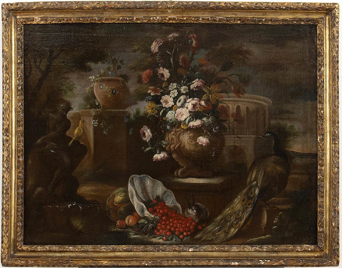 Natura morta con fiori e pavone