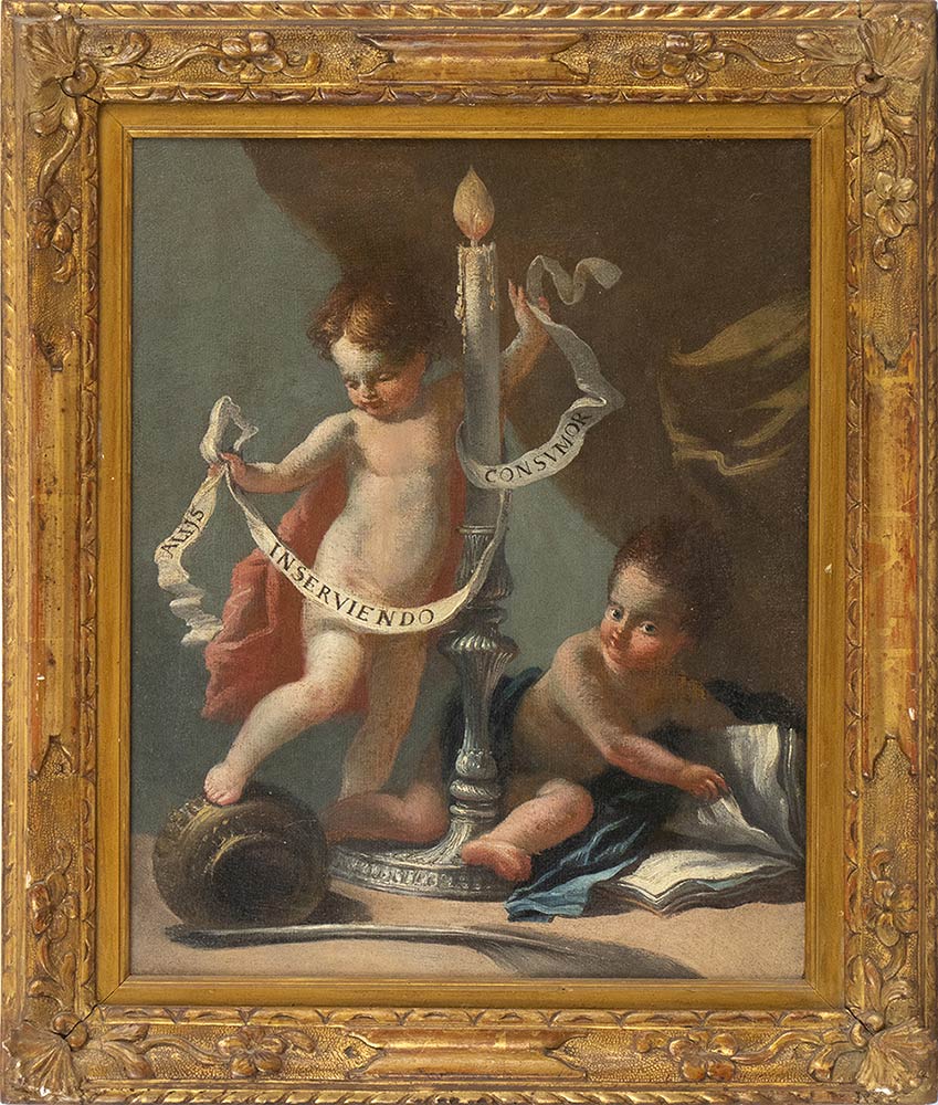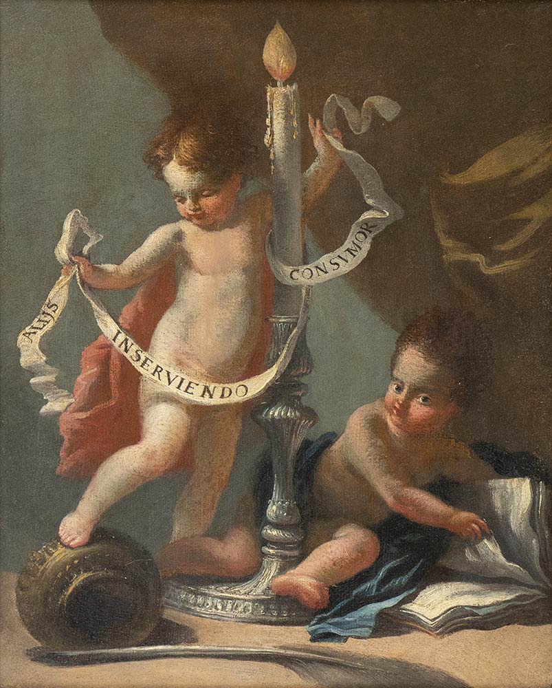 Questo raffinato dipnto allegorico rappresenta due putti ai lati di una grande candela accesa. Quello di sinistra agita intorno alla candela un cartiglio con la scritta “Alijs inserviendo consumor” (mi consumo servendo gli altri) e calpesta con il piede destro un calamaio rovesciato, lo stesso che il putto posto sulla destra, intento a sfogliare le pagine di un tomo, avrebbe utilizzato per scrivere, ad indicare così la superiorità della carità rispetto allo studio. Il linguaggio pittorico di chiaro gusto francese e soluzioni ricorrenti come il volto del puttino in piedi riconducono l’opera alla produzione di Vittorio Amedeo Rapous, allievo del Beaumont e raffinato esponente del barocco piemontese.