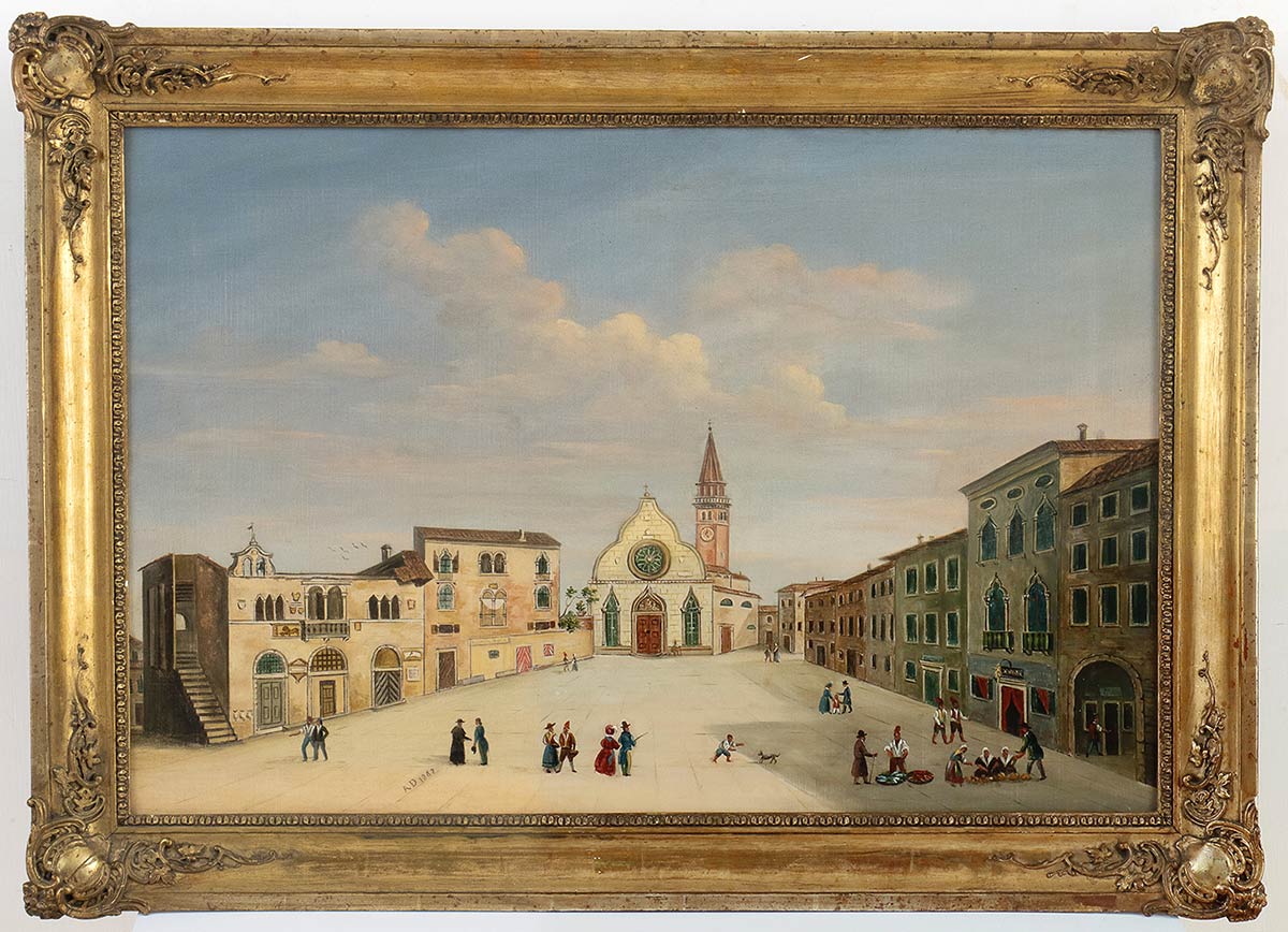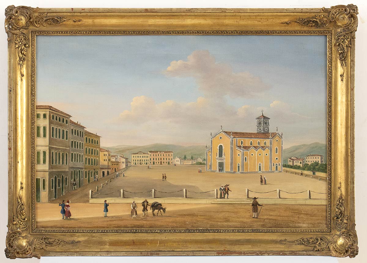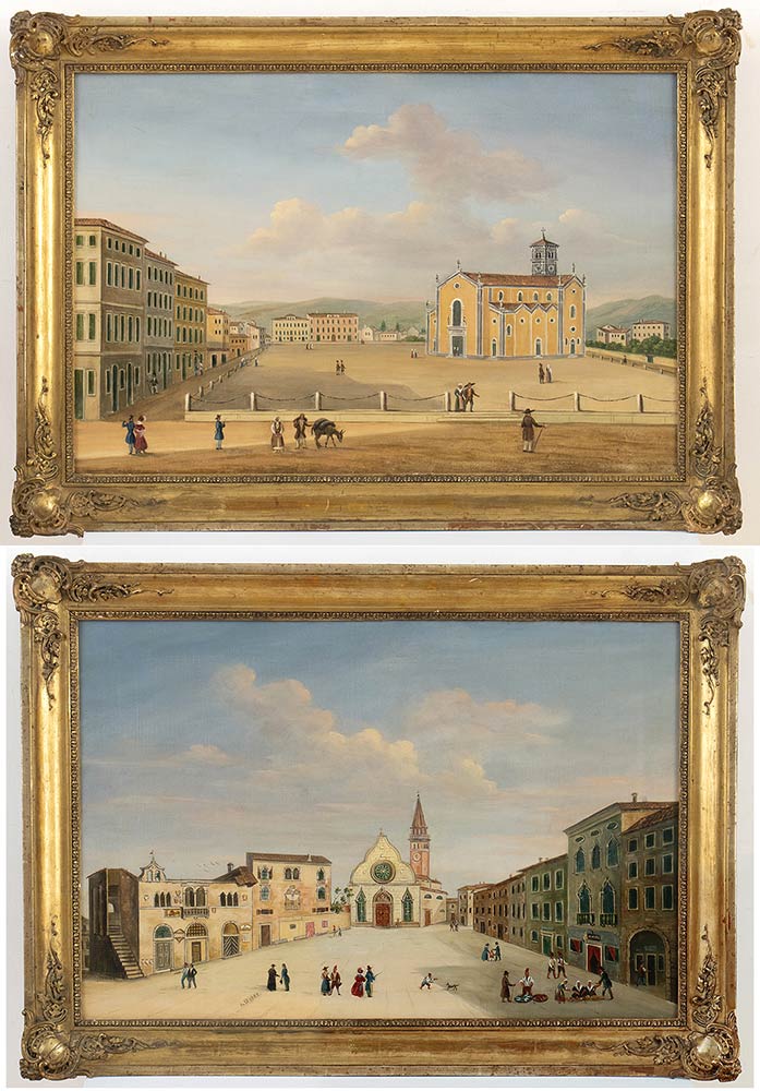 Due piazze di paesi del Veneto (di fantasia?), Coppia di dipinti en pendant