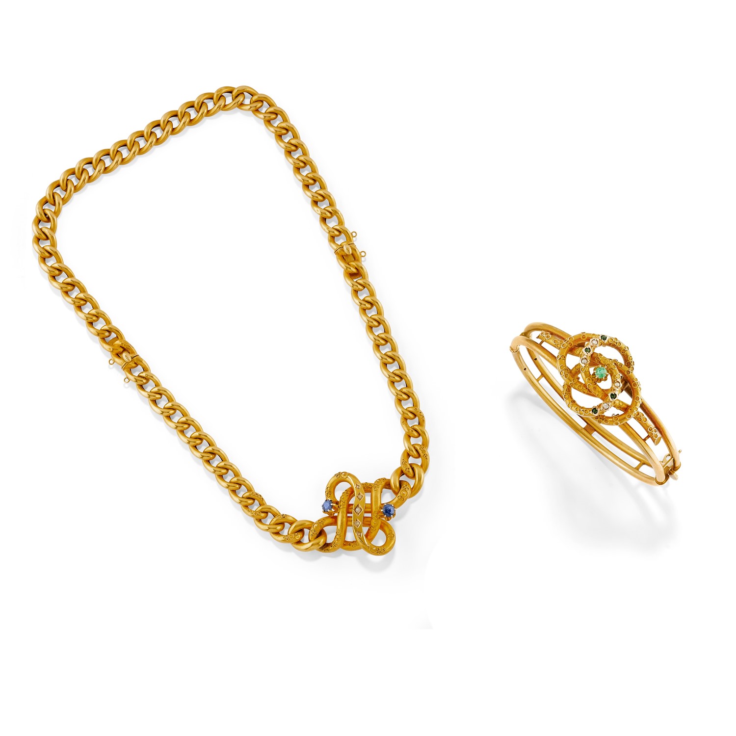 zaffiri, smeraldo e microperle, composto da collana e bracciale realizzati a canna vuota.
