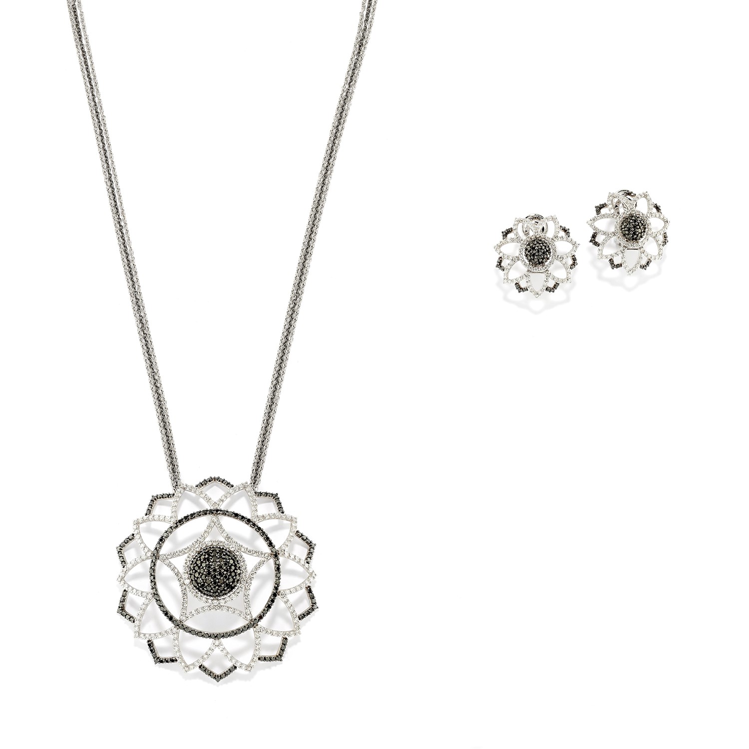 diamanti taglio brillante ct 6,50 ca e diamanti neri taglio rotondo sfaccettato ct 5,00 ca, composta da collana e coppia di orecchini con disegno floreale.