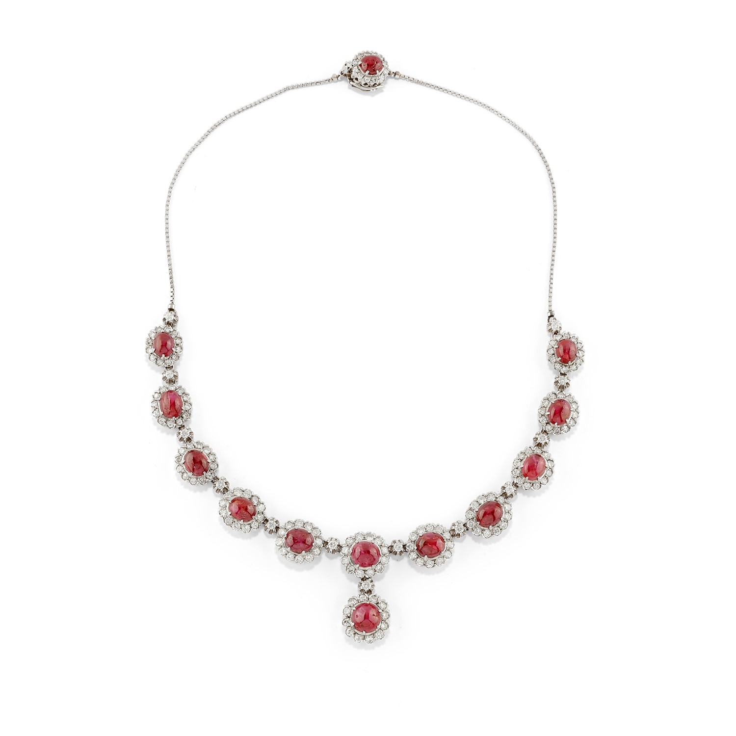 rubini taglio ovale cabochon ct 20,00 ca, diamanti taglio huit-huit e brillante ct 8,00 ca.