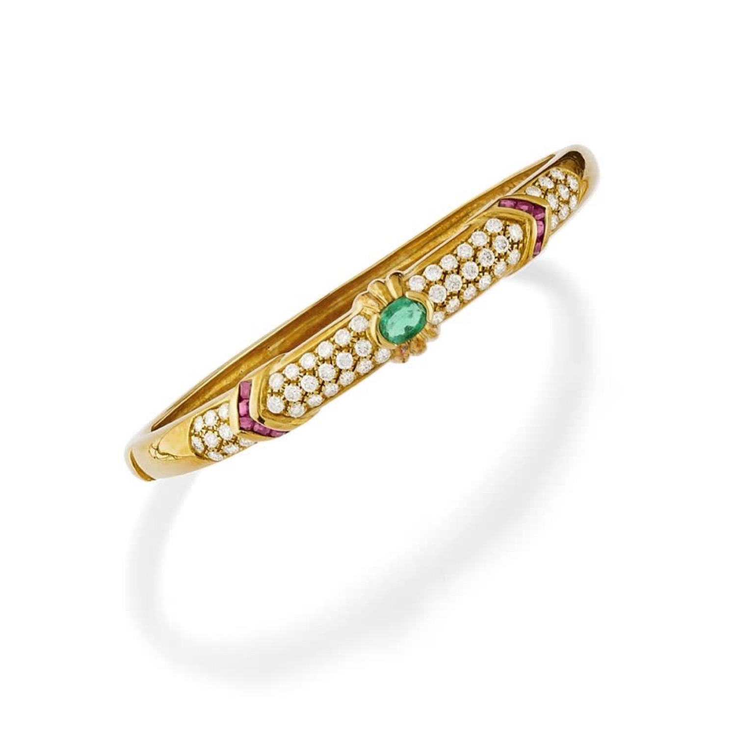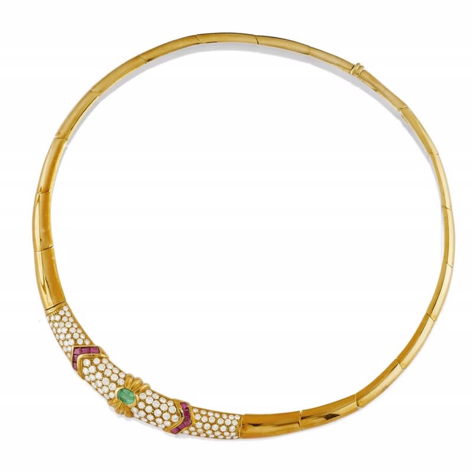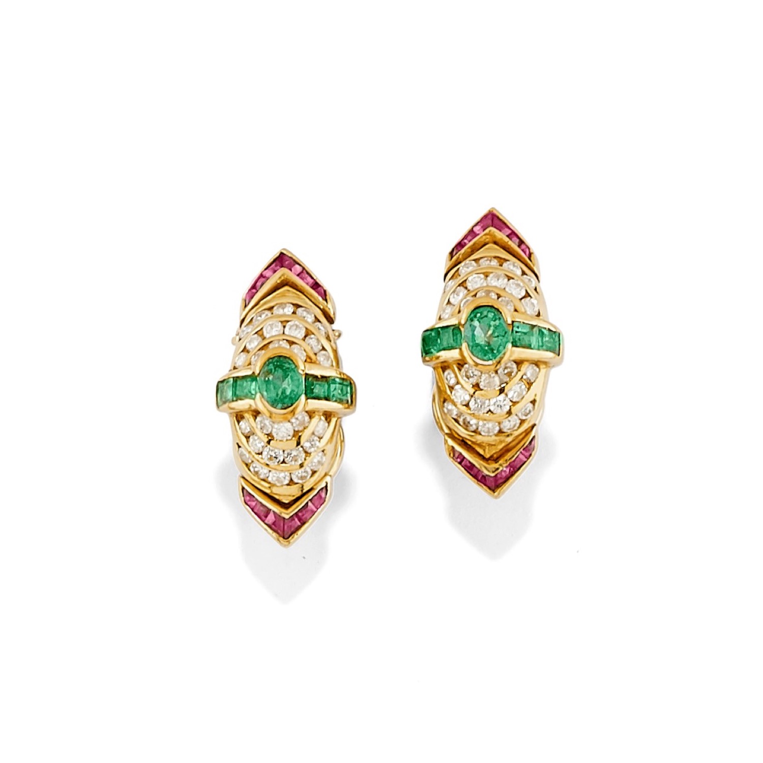 smeraldi, rubini e diamanti taglio brillante ct 5,00 ca, composta da collana, bracciale e coppia di orecchini.