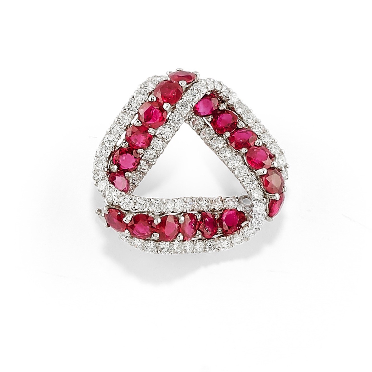 rubini taglio rotondo ct 5,50 ca e diamanti taglio brillante ct 2,50 ca, a triangolo.