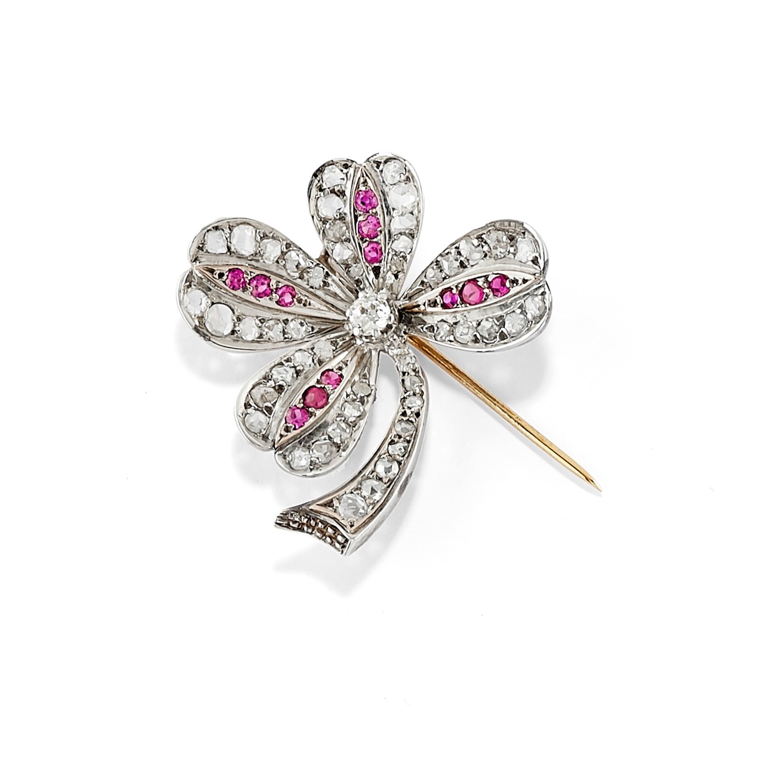 oro bassa caratura, rubini e diamanti taglio vecchio e rosa, a forma di quadrifoglio.