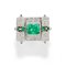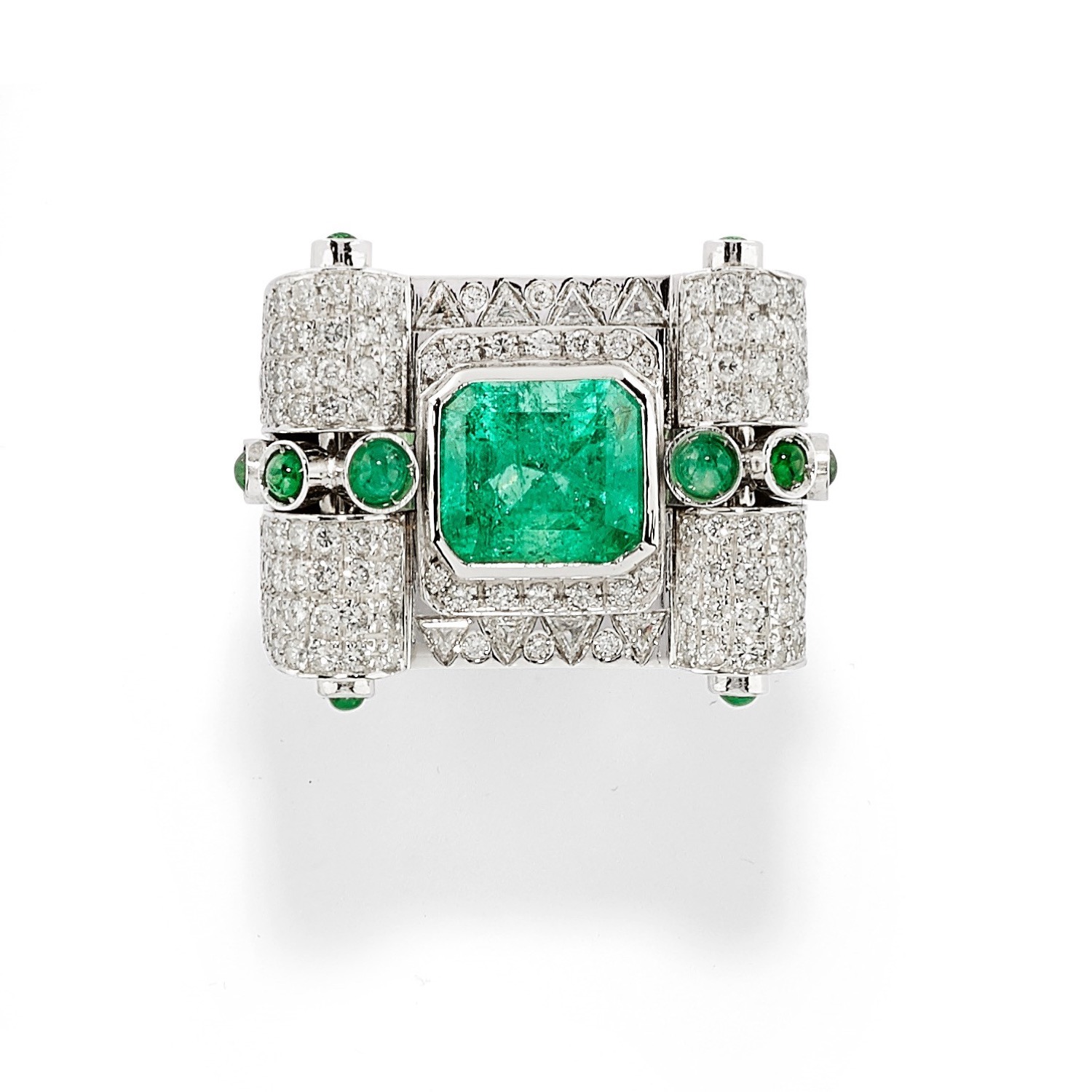smeraldi e diamanti, al centro uno smeraldo Colombia taglio rettangolare a contorno ottagonale ct 7,90 ca, ai lati smeraldi taglio cabochon ct 1,70 ca, diamanti taglio brillante e triangolo ct 7,30 ca.