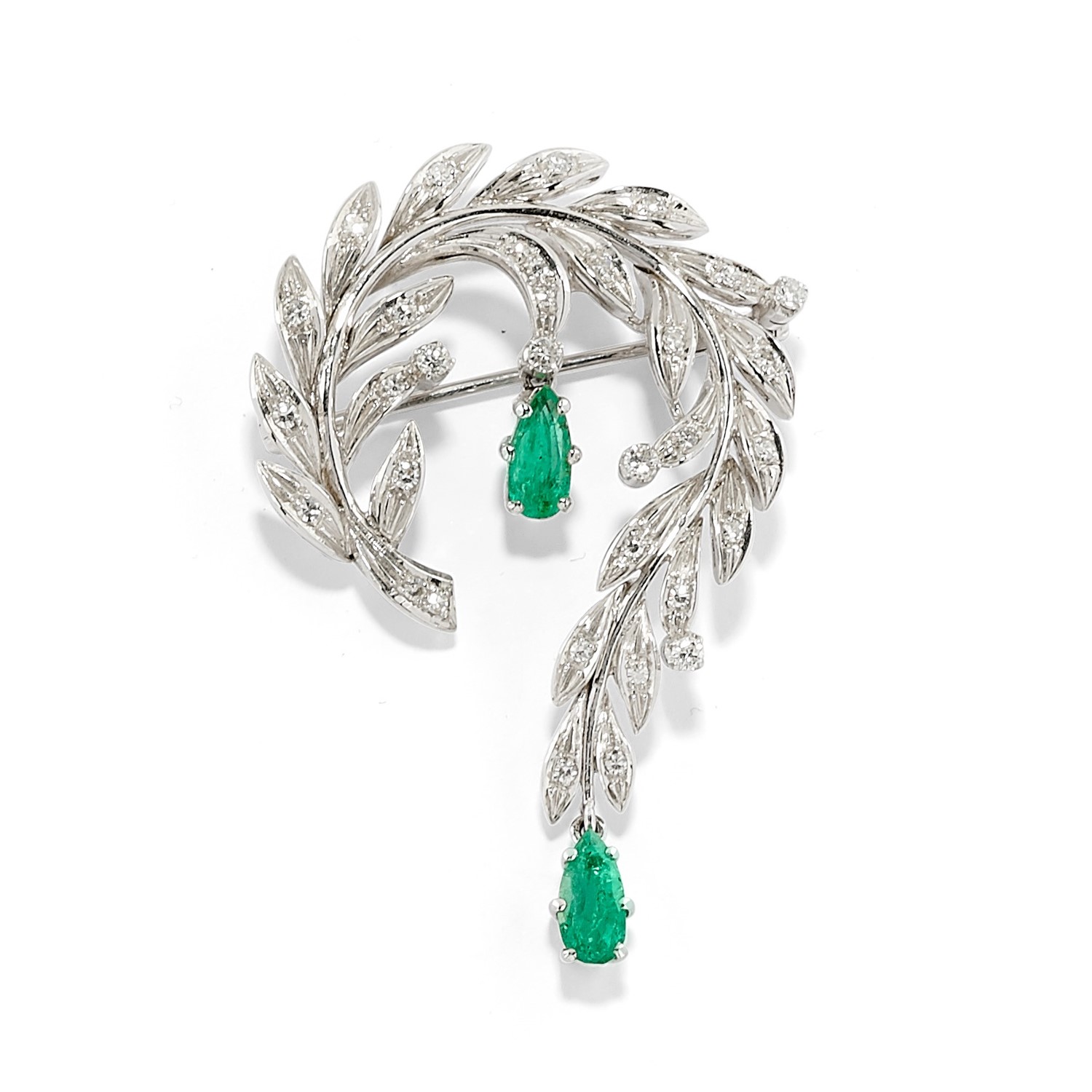 smeraldi taglio goccia, diamanti taglio huit-huit e brillante, a motivo floreale.