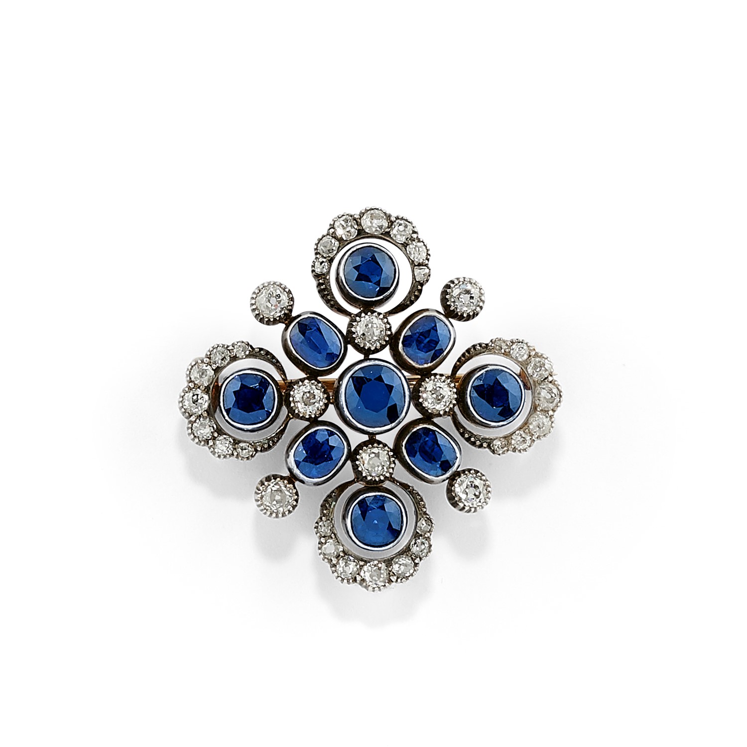 diamanti taglio vecchio ct 2,50 ca e zaffiri taglio rotondo e ovale ct 7,50 ca, di forma quadrilobata.