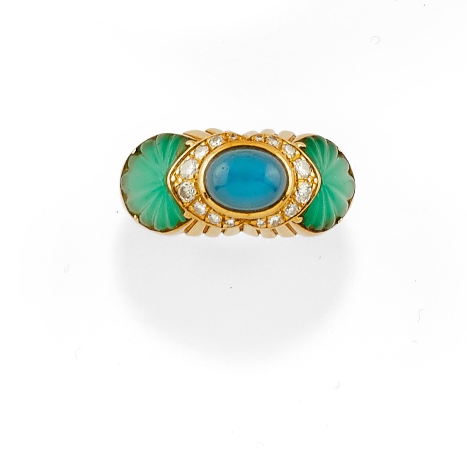 pietra blu (prob. calcedonio), pietre verdi (prob. crisoprasio) e diamanti taglio brillante, collezione "Baroda", con astuccio e certificato.