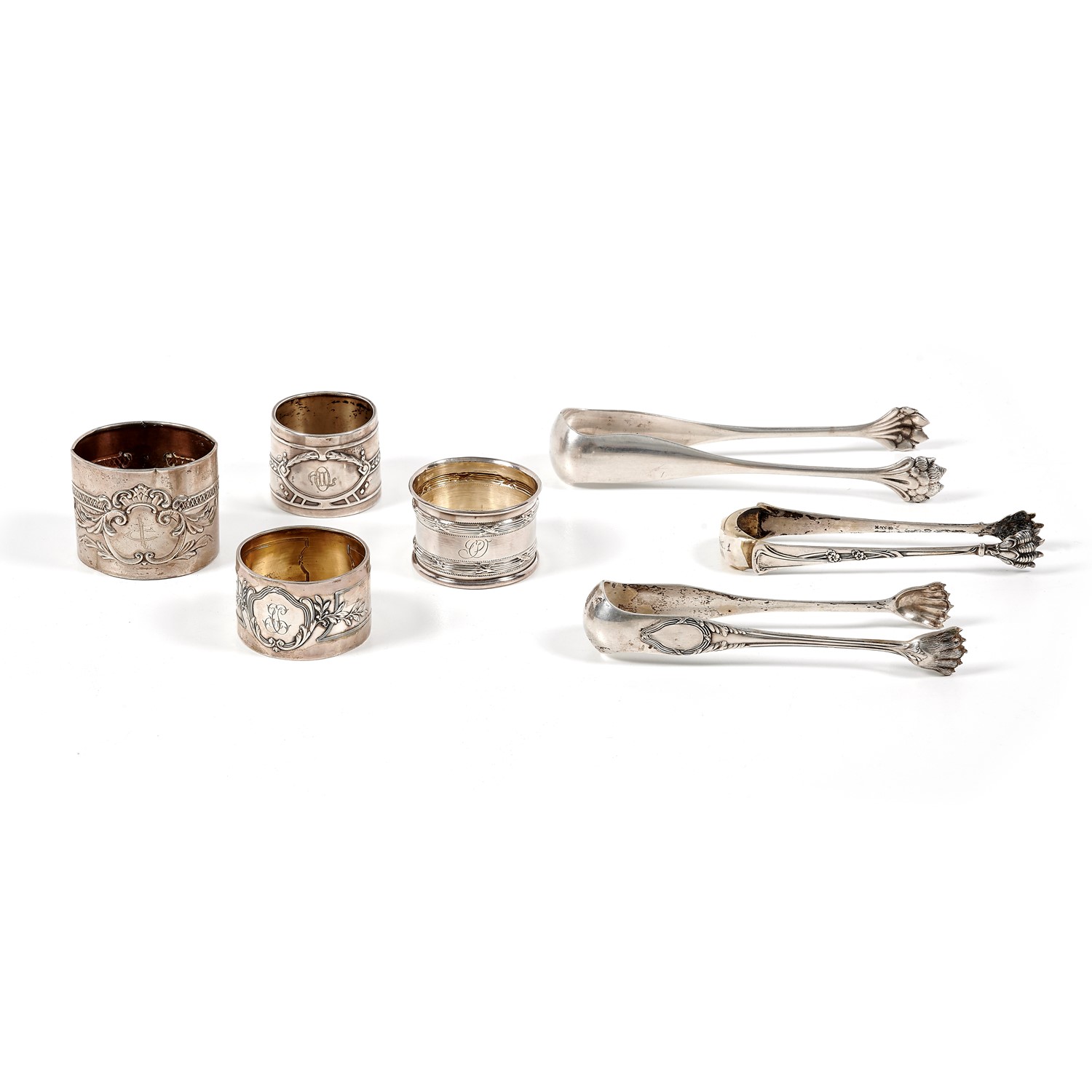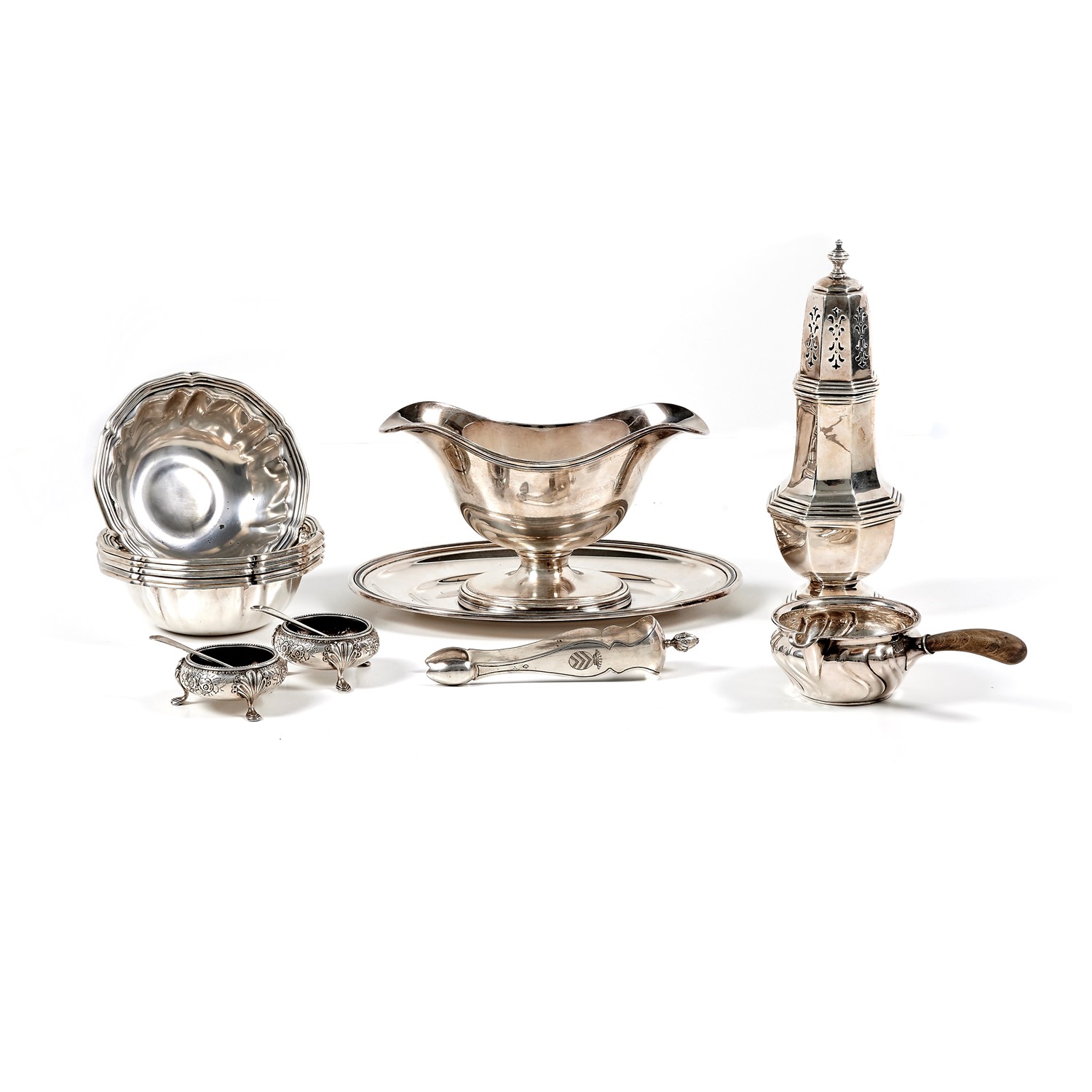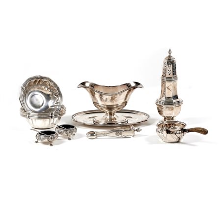 uno spargi zucchero Birmingham 1920 circa, sei ciotole prima metà XX secolo, un salsiera, quattro pinze da ghiaccio, quattro portatovaglioli, due saliere con cucchiaini in Sheffield 1871.
