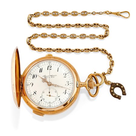 tripla cassa, contatore bianco con numeri arabi in smalto nero, secondi al sei, pulsante cronografia ore dodici, suoneria ore e quarti, trattenuto da collana in maglia marinara non coeva in oro giallo 18K.