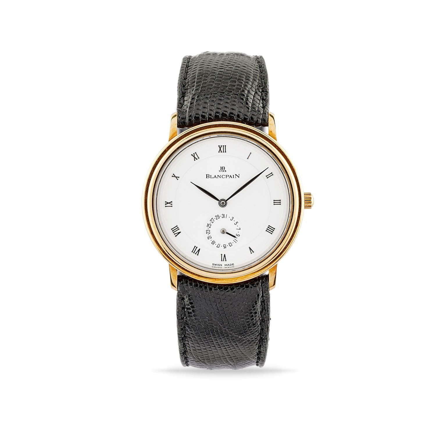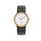 cassa rotonda, quadrante chiaro con numeri romani applicati, calendario mensile ore sei, movimento a carica automatica.