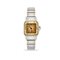 in acciaio e oro giallo, cassa quadrata quadrante chiaro con numeri romani in smalto nero, movimento al quarzo.