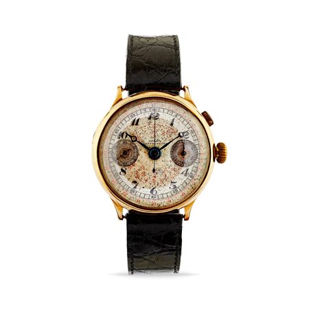 quadrante chiaro puntinato, numeri arabi in smalto nero, secondi al centro, due contatori, fondello a cerniera, movimento a carica manuale.
