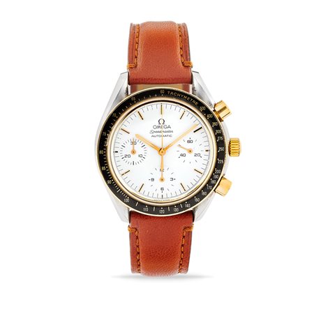 cronografo in acciaio e oro giallo 18K, cassa rotonda, quadrante chiaro con indici applicati, tre contatori, movimento a carica automatica.
