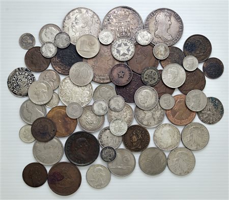 Circa 62 monete di vari Stati, in argento e altri metalli, compreso un falso d'epoca da 8 reales del 1791 Lima.