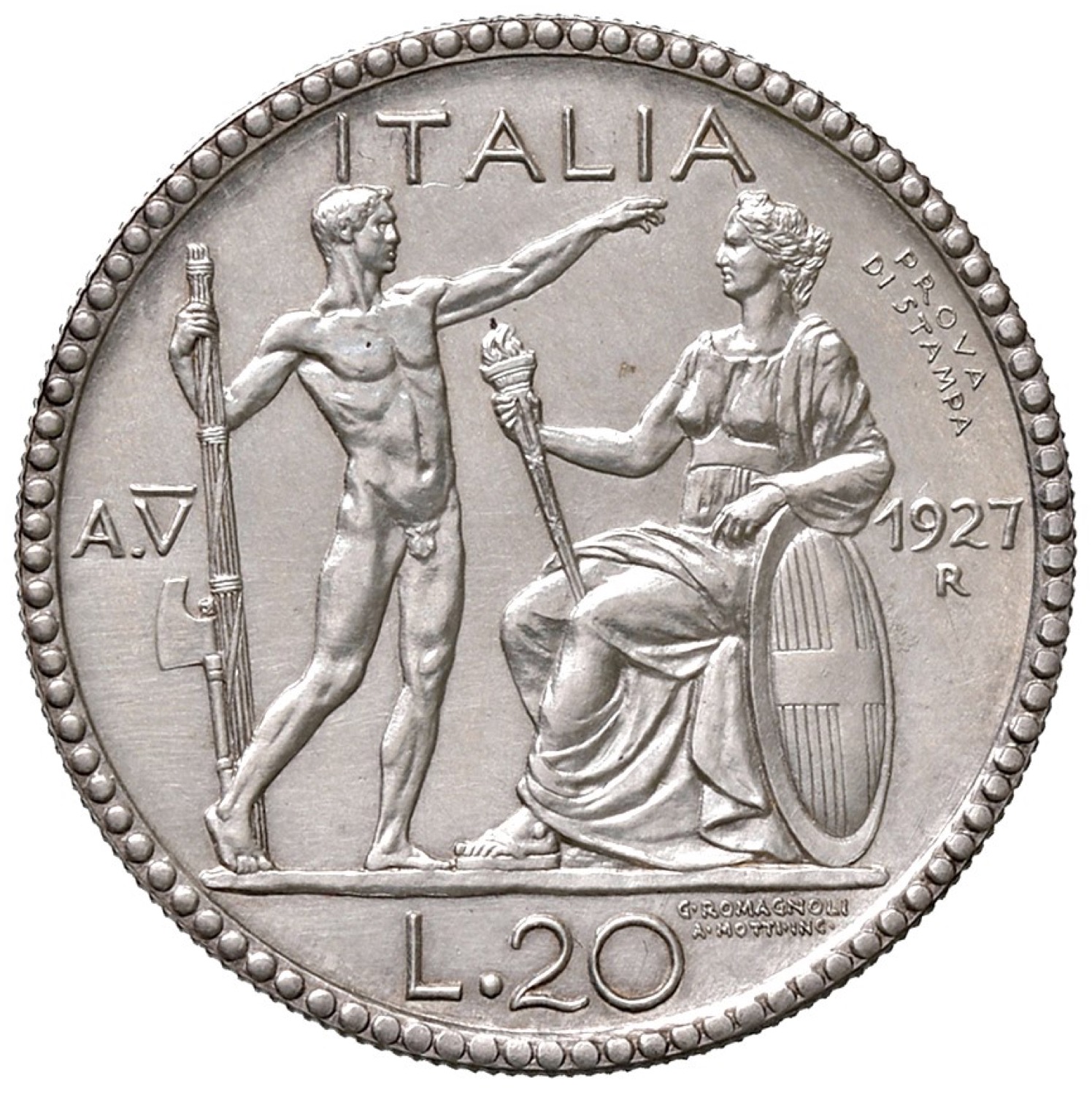 20 lire 1927 anno V, prova di stampa. Luppino PP 141 (R/4 valutata SPL 18.000 euro e non circolata 25.000). AG. Di grande rarità. FDC