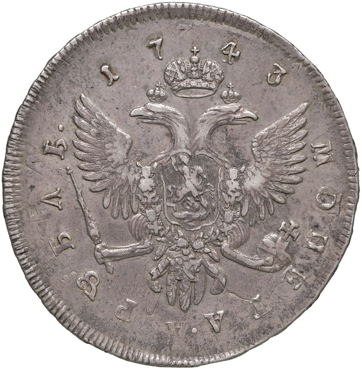 Rublo 1743. C. 19b.4. AG. Bel BB con bei fondi e piacevole patina.