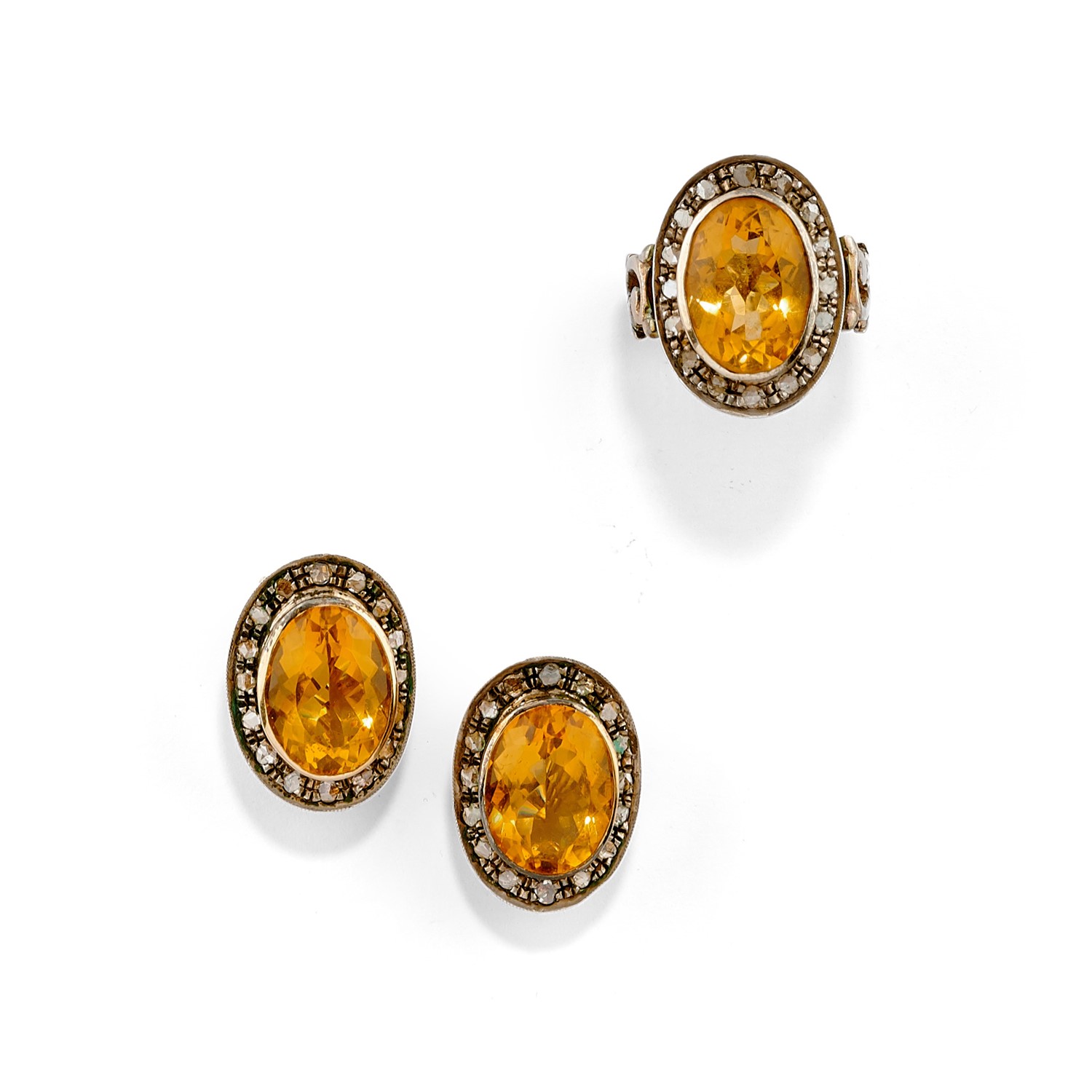 argento, quarzi e diamanti taglio rosa, composta da collana e coppia di orecchini.