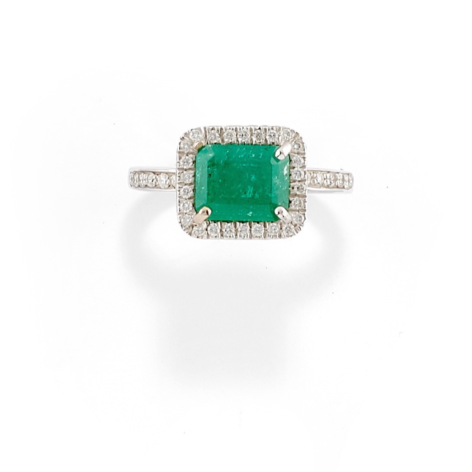 smeraldo taglio rettangolare a contorno ottagonale ct 1,50 ca e piccoli diamanti taglio brillante a decoro.