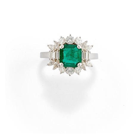 smeraldo quadrangolare a contorno ottagonale ct 2,00 ca, diamanti taglio brillante, baguette e navette ct 2,50 ca.