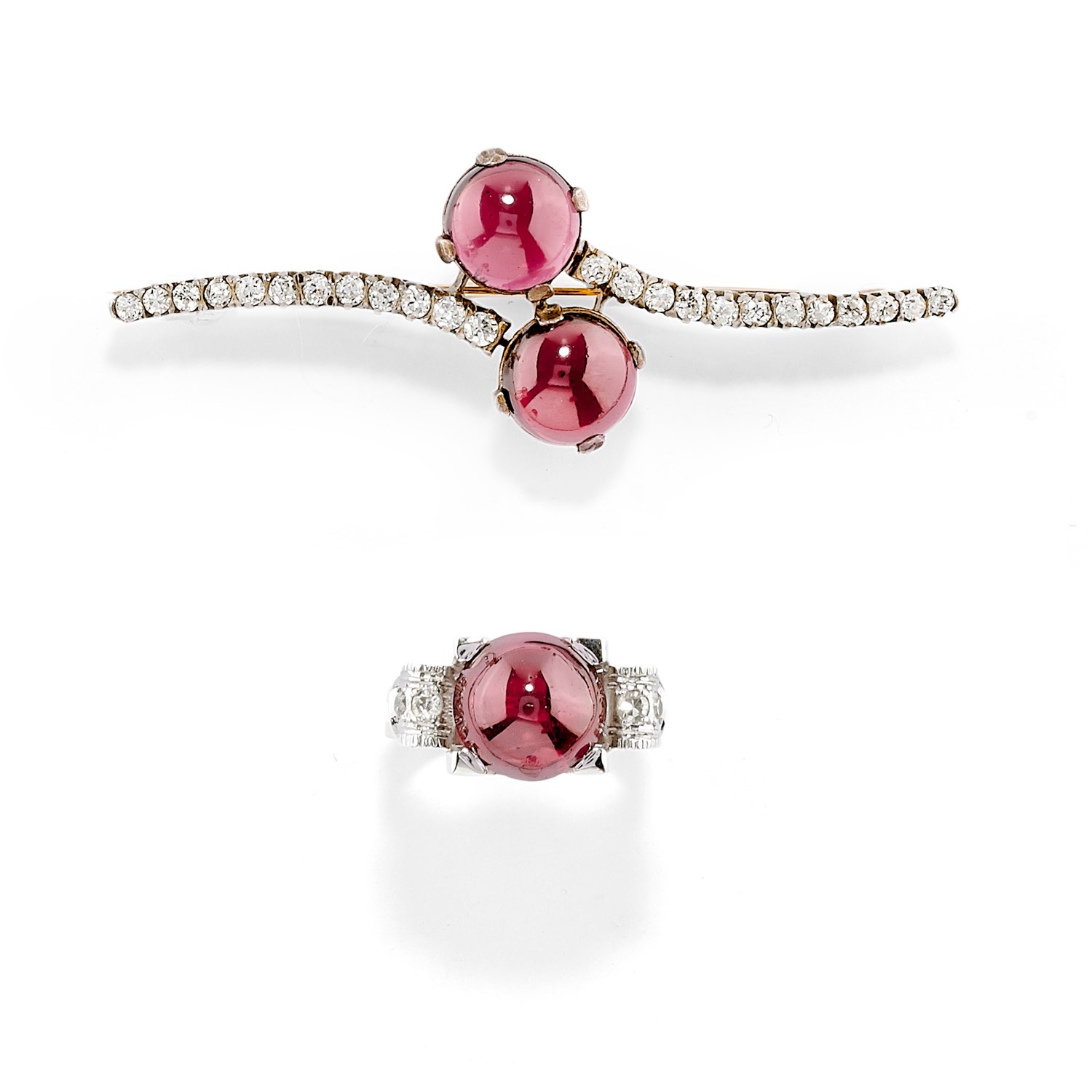 oro bicolore 18K, granati e diamanti, composto da spilla e anello.
