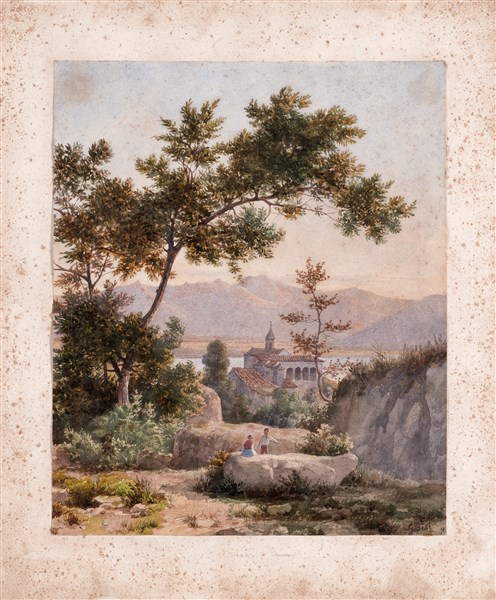 Giuseppe Bisi "Paesaggio lacustre" acquerello su carta (cm 23,5x19) Firmato in