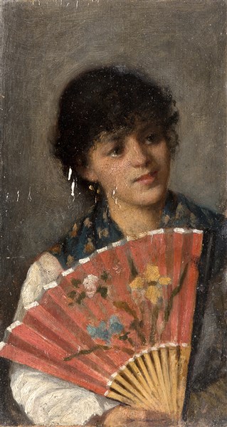Maestro veneto del XIX Secolo "Donna con ventaglio" olio su tavola (cm 23x13