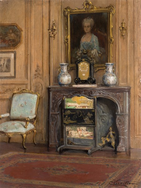 Cesare Vianello "Interno con caminetto" olio su compensato (cm 35x26) Firmato i