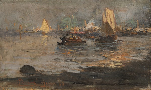Pompeo Mariani "Porto di Genova" '92 olio su tavola (cm 14x23)Firmato , loc