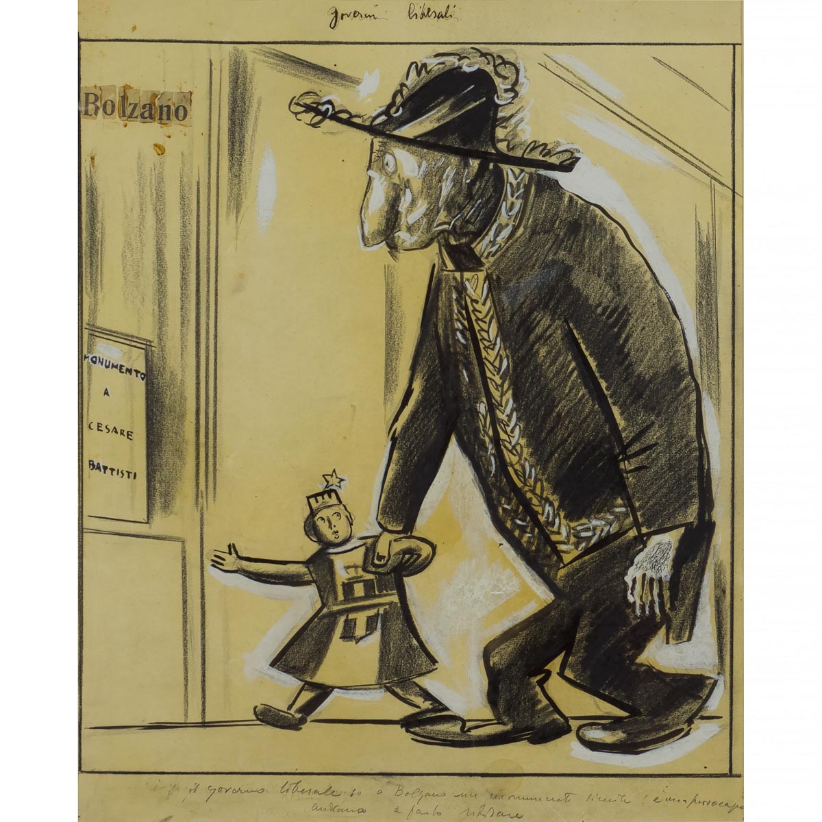 "Governi liberali/Il Governo liberale:- A Bolzano un monumento simile! E' una provocazione", 1926, china, matita litografica, biacca e collage su carta, iscrizione in basso al centro, entro cornice.