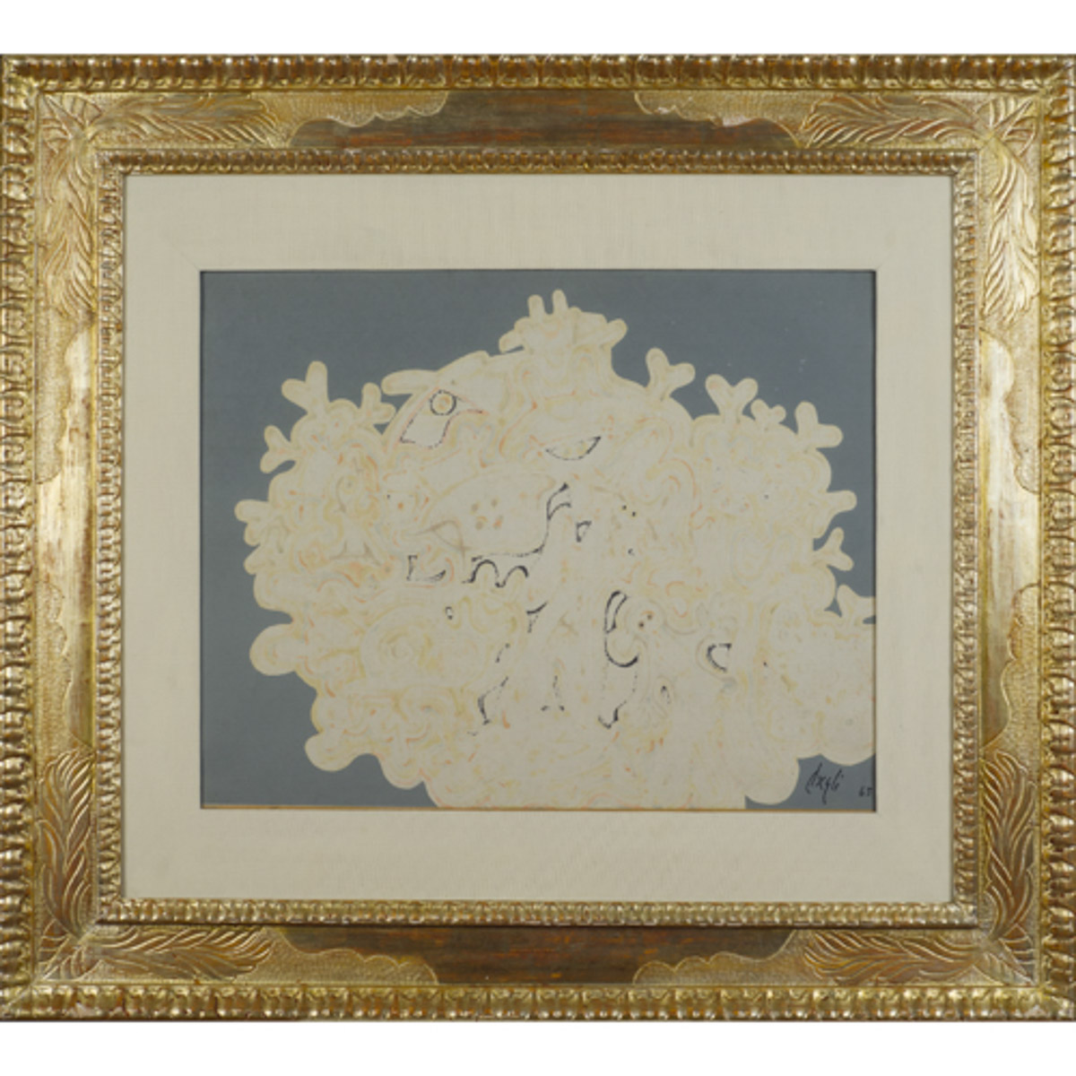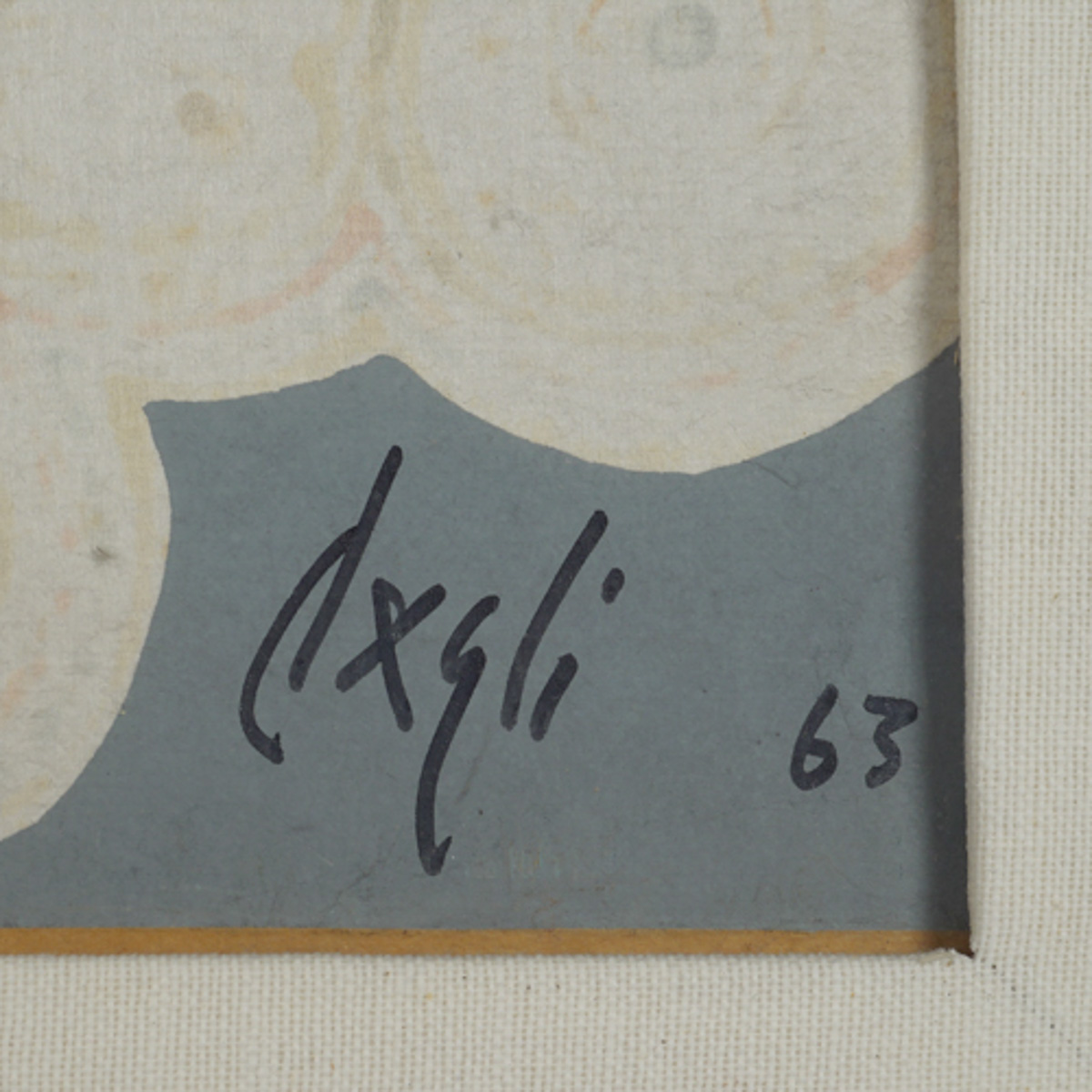 "Composizione", 1963, tempera su carta intelata, firmata e datata in basso a destra, entro cornice