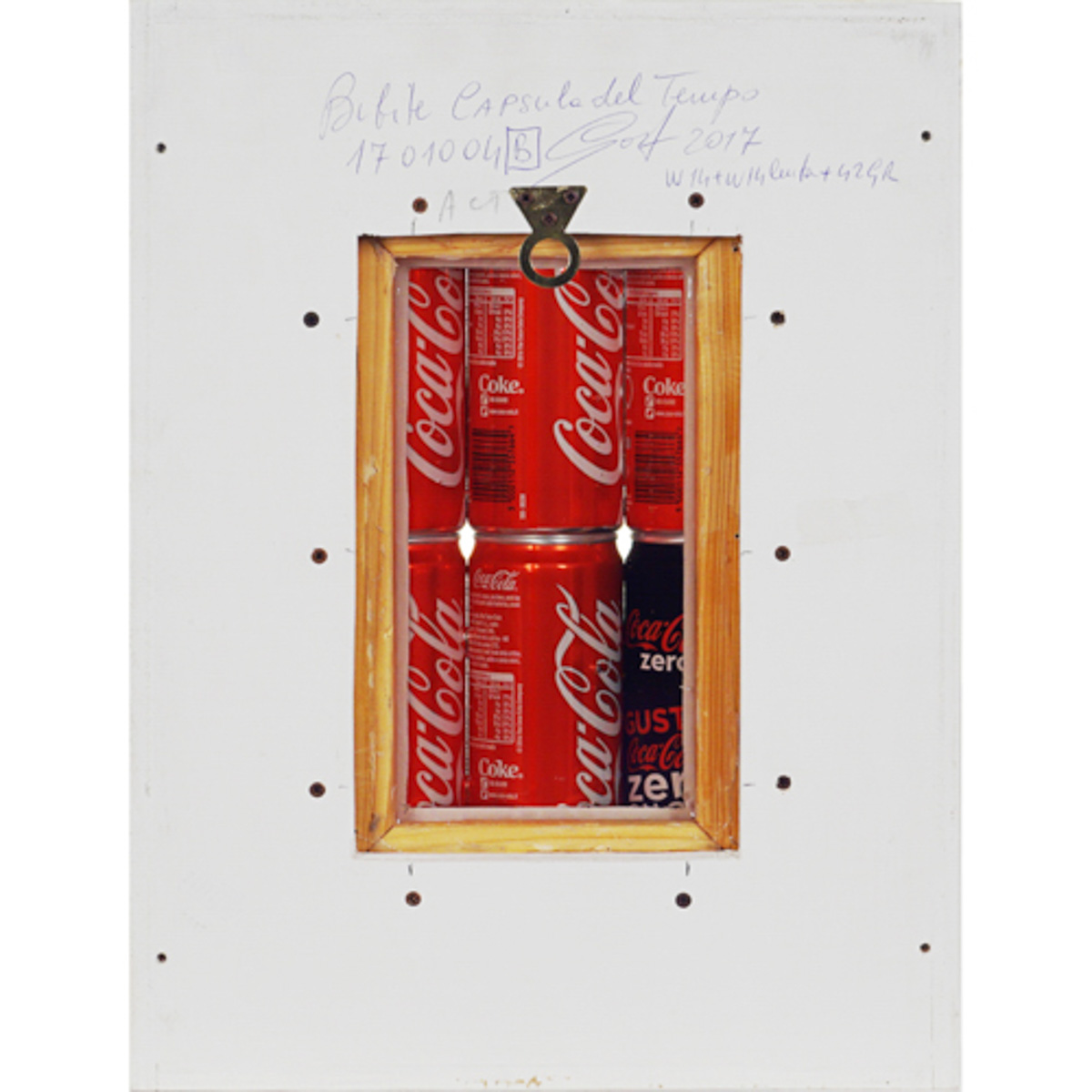 "Bibite (capsula del tempo)", 2017, lattine di bibite con resina, firma titolo e anno sul retro, autentica dell'artista su fotografia
