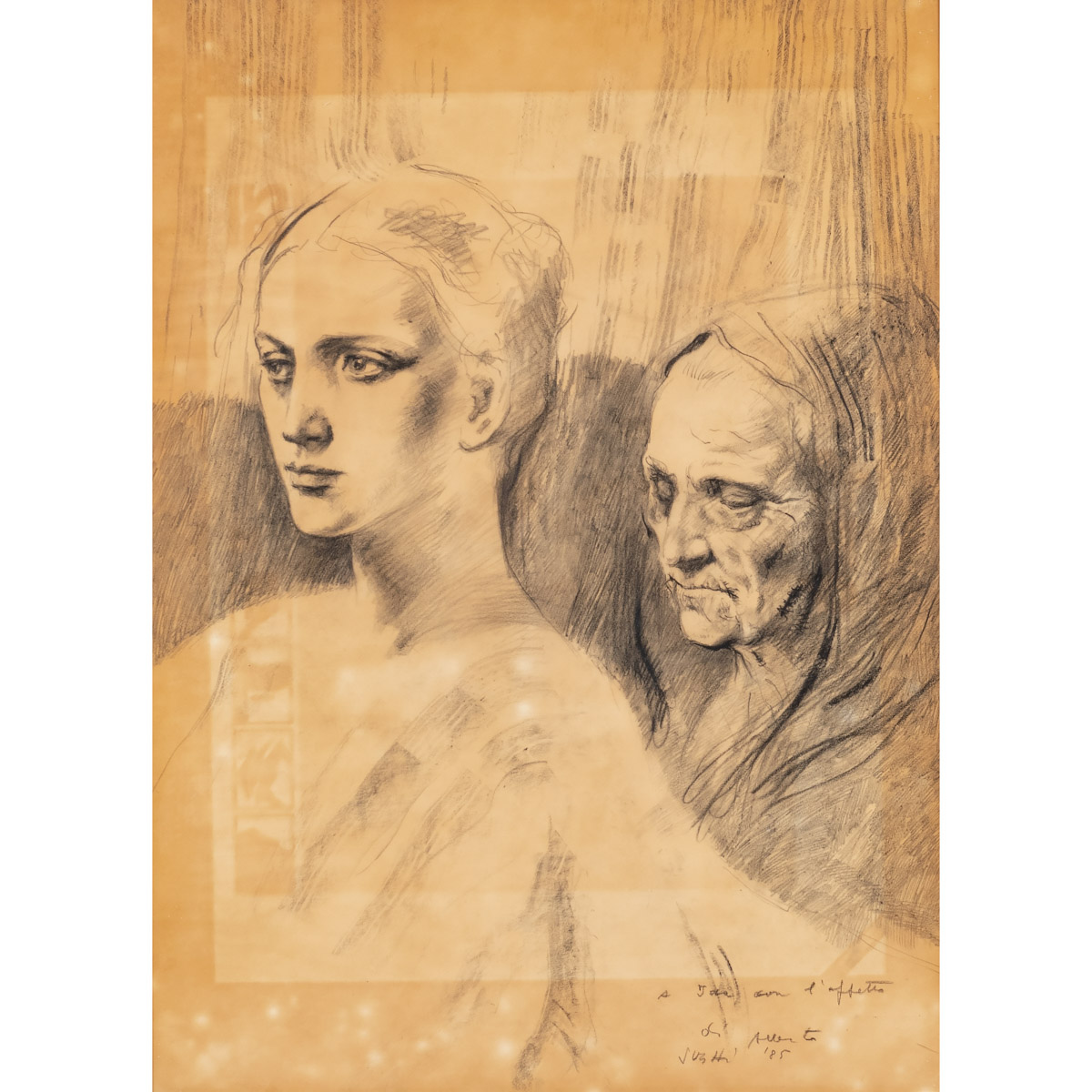 "Le due età", 1985, matita su lucido, firmata e datata con dedica in basso a destra, entro cornice