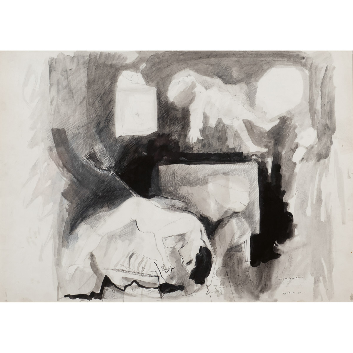"Non avrà il bambino", 1961, china, carboncino e acquarello su carta, firmato e datato in basso a destra, entro cornice. Collezione Dario Micacchi
