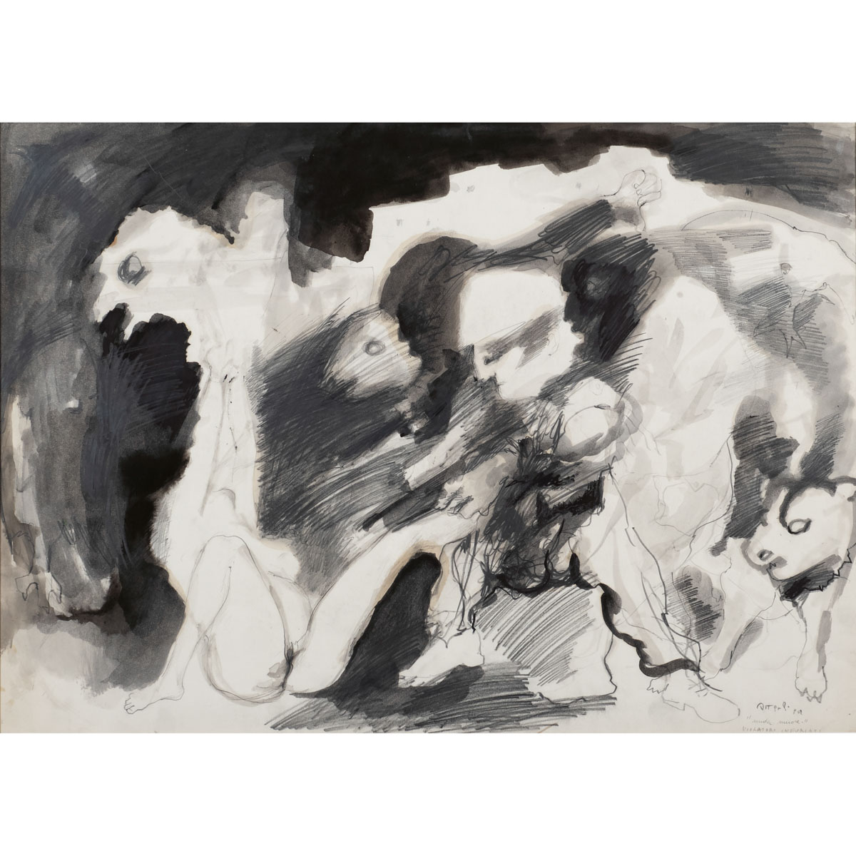 "Nuda muore Violatori infuriati", 1962, china, carboncino e acquarello su carta, firmato e datato in basso a destra, entro cornice. Collezione Dario Micacchi