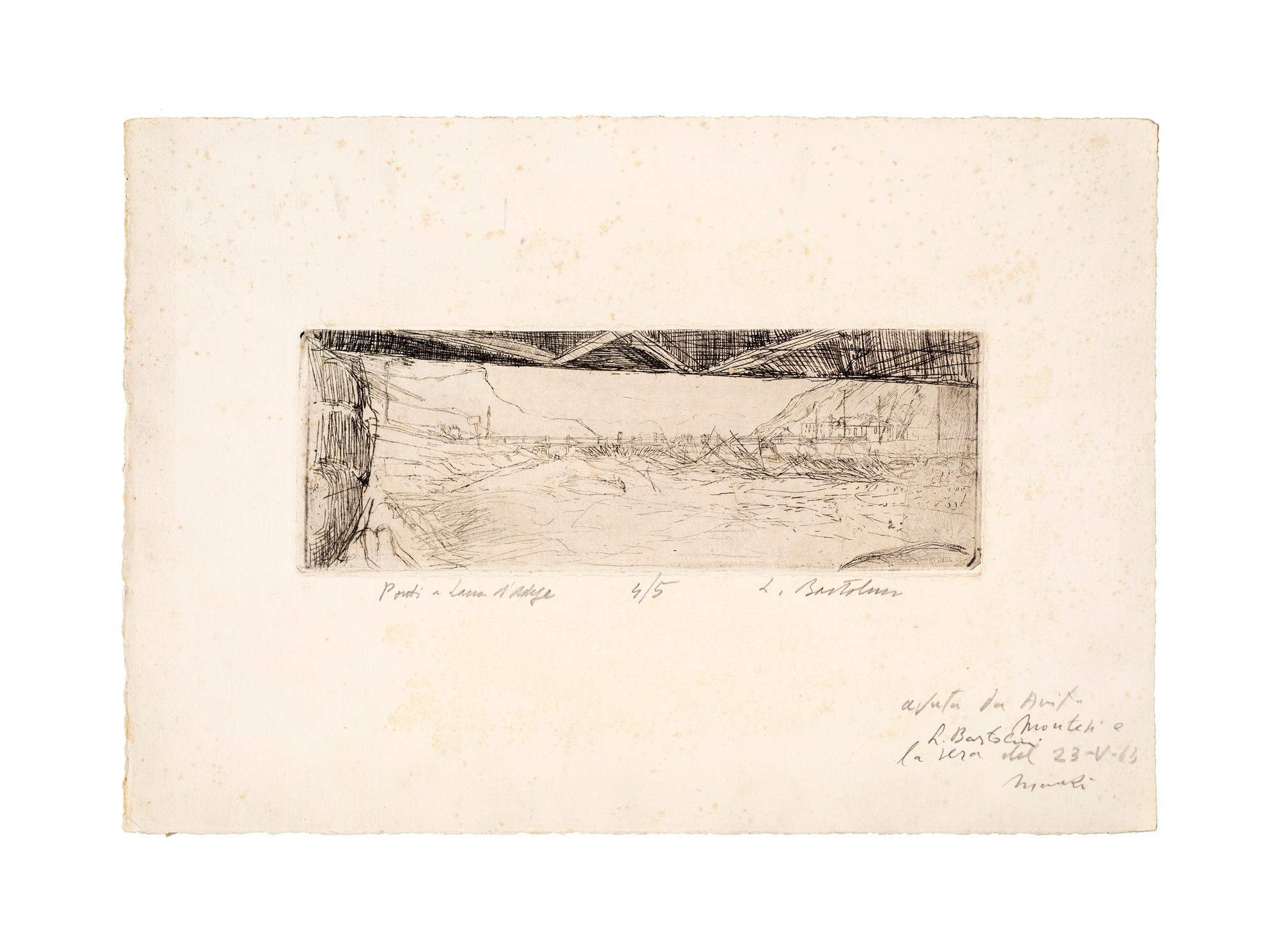 Dimensioni foglio cm 35,2x50,4. Dimensioni lastra cm 12,2x33,7. Titolo, numerazione e firma sul fronte a matita. Esemplare 4/5. Dedica a Giacomo Manzù sul fronte.