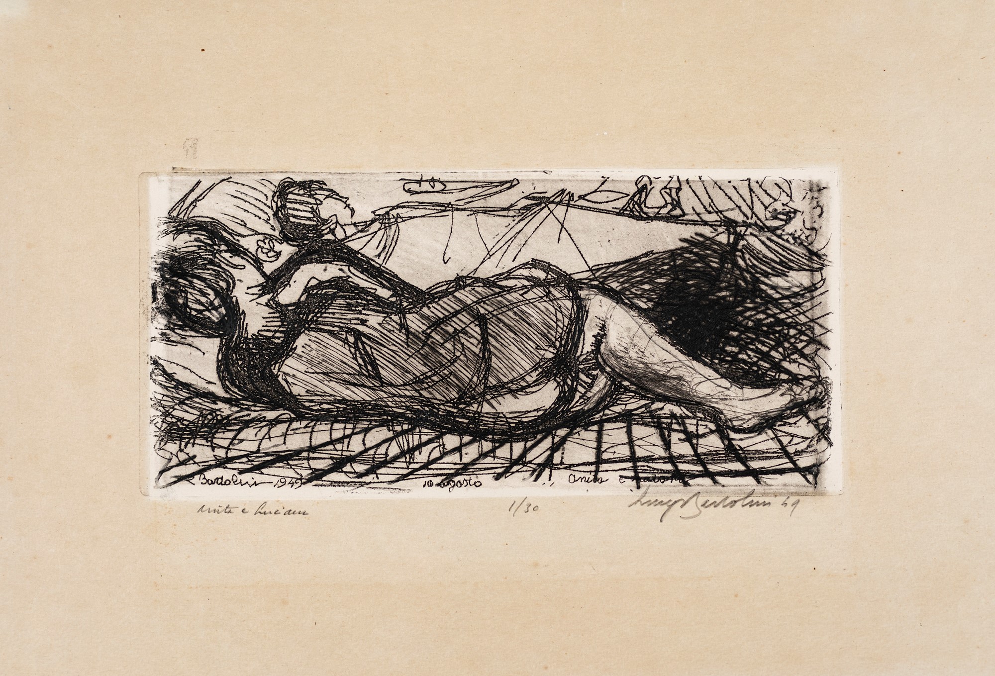 Dimensioni cm 30,6x45,5 (foglio), cm 14x30,3 (lastra). Firma, numerazione, anno e titolo sul fronte a matita "Anita e Luciana, 1/30, Luigi Bartolini '49". Firma, data e titolo su lastra.