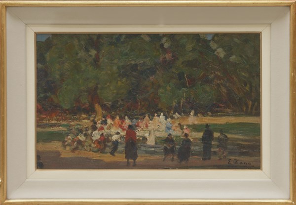 E. Zago "La vasca ai giardini di Milano" olio su compensato (cm 32x51) Reca firm